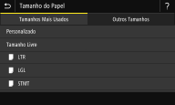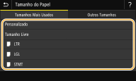 Se a tela mostrada acima não for exibida quando o papel for carregadoSe você carrega sempre o mesmo papel na bandeja multiuso, você pode ignorar as operações de configuração de papel registrando o tamanho e o tipo de papel como a configuração padrão. Quando a configuração padrão é registrada, entretanto, a tela mostrada acima não é exibida. Para visualizar a tela, selecione <Especificar ao Colocar Papel> (Registrando as configurações de papel padrão para a bandeja multiuso).