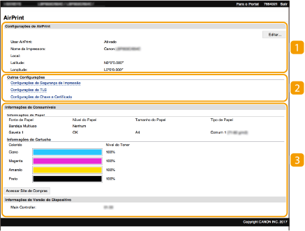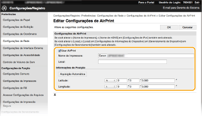 Você pode registrar informações, incluindo o nome da máquina e o local de instalação, usadas para identificar a máquina. Você também pode desabilitar o recurso AirPrint da máquina. Use a Interface Remota para alterar estas configurações.