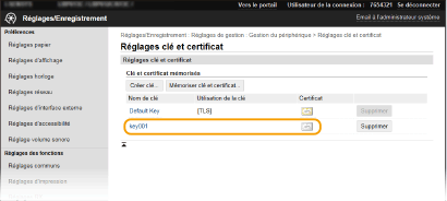 Il est impossible de supprimer une clé avec certificat en cours d'utilisation pour une fonction, comme par exemple lorsque "[TLS]" ou "[IEEE 802.1X]" s'affiche sous [Utilisation de la clé]. Dans un tel cas, désactivez la fonction ou remplacez la clé avec certificat utilisée avant de la supprimer.