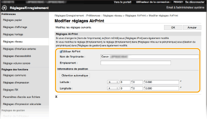 Permet de vérifier les valeurs saisies pour les réglages AirPrint, comme le nom et l'emplacement de l'appareil. Vous pouvez cliquer sur [Modifier] pour modifier les réglages.