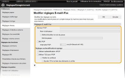 Selon le réseau utilisé, vous pouvez être amené à modifier la configuration du port POP3 ( Modification des numéros de port). Pour plus d'informations, contactez votre fournisseur d'accès Internet ou votre administrateur réseau.