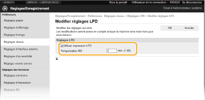 Spécifiez une valeur pour le délai d'attente du redémarrage pour la réception des données. Si la réception des données ne reprend pas au cours de la période définie, l'impression est annulée. |