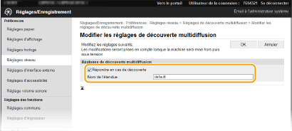Cochez la case pour définir l'appareil de sorte qu'il réponde aux paquets de découverte de multidiffusion et permette la surveillance par le logiciel de gestion des périphériques. ![]() Pour modifier le numéro de port de découverte multidiffusion, reportez-vous à la section Modification des numéros de port.