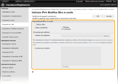 Se gli indirizzi IP sono immessi in modo non corretto, potrebbe non essere possibile accedere alla macchina dalla IU remota, in questo caso è necessario impostare <Filtro indirizzi IPv4> o <Filtro indirizzi IPv6> a <Off>.