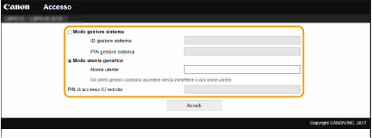 Selezionare [Modo gestore sistema] o [Modo utente generico], quindi immettere un valore in [PIN di accesso IU remota] se necessario.