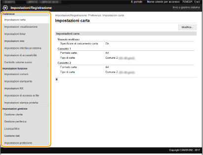 È possibile modificare le varie impostazioni della macchina tramite la IU remota. È inoltre possibile configurare la maggior parte delle impostazioni sulla macchina, ma per alcune è possibile utilizzare solo la IU remota. In questa sezione viene descritto il flusso di lavoro base per modificare le impostazioni della macchina usando la IU remota.