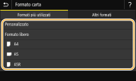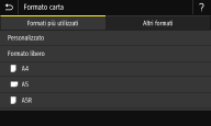 Se non viene visualizzata la schermata precedente quando si carica la cartaSe si carica sempre la stessa carta vassoio multiuso, è possibile ignorare le operazioni di impostazione carta registrando formato e tipo di carta come impostazioni predefinite. Quando si registra l'impostazione predefinita, tuttavia, la schermata illustrata sopra non viene visualizzata. Per visualizzare la schermata, selezionare <Specificare al caricamento carta> (Registrazione delle impostazioni predefinite per la carta per il vassoio multiuso).