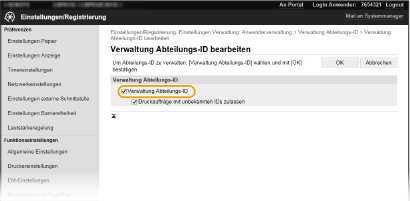 Aktivieren Sie das Kontrollkästchen [Verwaltung Abteilungs-ID verwenden].