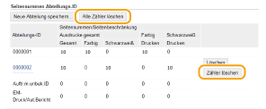 Wenn Sie die Zähler auf Null zurücksetzen möchten, klicken Sie auf den entsprechenden Textlink unter [Abteilungs-ID] und dann auf [Zähler löschen] /b_key_arrow_right.gif) [OK]. Wenn Sie die Zähler für alle Abteilungs-IDs auf Null zurücksetzen möchten, klicken Sie auf [Alle Zähler löschen] /b_key_arrow_right.gif) [OK].