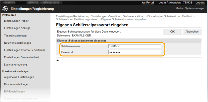 Geben Sie das Passwort des privaten Schlüsselsatzes für die zu registrierende Datei mit alphanumerischen Zeichen ein.