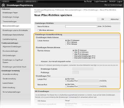 Wählen Sie diese Einstellung, wenn IPSec für alle an die und von der IPv6-Adresse des Geräts gesendeten IP-Pakete verwendet werden soll.