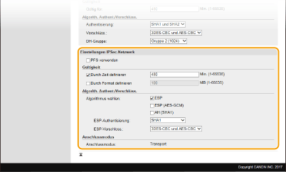 Legen Sie die Einstellungen für [Gültig für] und [Authentisierung]/[Verschlüss.]/[DH-Gruppe] fest.