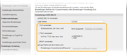 Hierbei sind fast die gleichen Einstellungen wie für TTLS erforderlich. Als internes Protokoll wird MS-CHAPv2 verwendet. Aktivieren Sie TLS für Remote UI, bevor Sie diese Authentisierungsmethode konfigurieren (