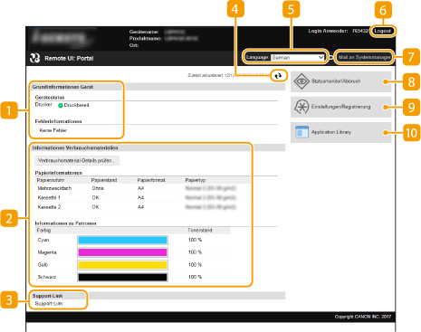 Wenn Sie sich bei Remote UI anmelden, erscheint die folgende Portalseite. In diesem Abschnitt werden die auf der Portalseite angezeigten Elemente und die Grundfunktionen erläutert.