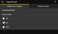 Wenn der Bildschirm oben beim Einlegen von Papier nicht angezeigt wirdWenn Sie immer dasselbe Papier in das Mehrzweckfach einlegen, können Sie die Schritte zum Einstellen des Papiers überspringen, indem Sie das Papierformat und den Papiertyp als Standardeinstellung speichern. Wenn die Standardeinstellung gespeichert ist, wird jedoch der oben abgebildete Bildschirm nicht angezeigt. Zum Aufrufen des Bildschirms wählen Sie <Beim Laden des Papiers angeben> (Speichern von Standardpapiereinstellungen für das Mehrzweckfach).