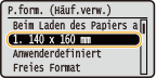 Die Papierformate, die in den Schritten oben gespeichert wurden, werden auf dem Bildschirm zum Auswählen der Papierformate für die Papierkassette oder das Mehrzweckfach angezeigt.