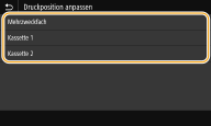 Wenn ein Dokument nicht in der Mitte oder außerhalb des bedruckbaren Bereichs gedruckt wird, passen Sie die Druckposition an. Sie können die Druckposition für jede Papierzufuhr anpassen. Sie können die Druckposition im Bereich von -5,0 bis +5,0 mm in Schritten von 0,1 mm anpassen.
