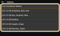 Stellen Sie <Zeitzone> ein, bevor Sie das aktuelle Datum und die Uhrzeit einstellen. Wenn Sie die Einstellung für <Zeitzone> später ändern, ändert sich das aktuelle Datum und die Uhrzeit entsprechend.
