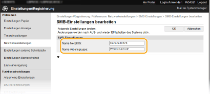 SMB (Server Message Block) (SMB) ist ein Protokoll für die Freigabe von Ressourcen wie Dateien und Drucker unter mehreren Geräten in einem Netzwerk. Sie müssen es verwenden, um das Gerät als einen freigegebenen Drucker in einem SMB-Netzwerk konfigurieren zu können. Je nach Netzwerk müssen Sie eventuell den NetBIOS- und den Workgroup-Namen einstellen.