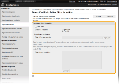 Cuando se selecciona [Rechazar] para un filtro de salida