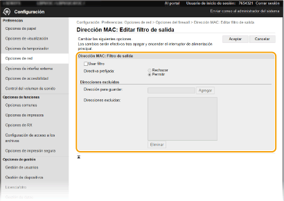 Si las direcciones MAC se introducen de forma incorrecta, es posible que no pueda acceder al equipo desde la IU Remota, en cuyo caso deberá establecer <Filtro de direcciones MAC> en <Off>. <Filtro de direcciones MAC>