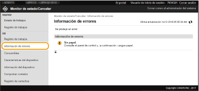 Cuando se produzca un error, esta página aparecerá haciendo clic en el mensaje que aparece debajo de [Información de errores] en la página del Portal (página principal).