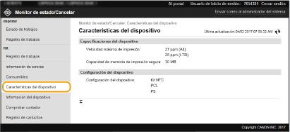 Se muestra información sobre el tamaño y el tipo de papel para el origen del papel, el número de modelo del cartucho de tóner, etc. También podrá hacer clic en [Comprobar detalles de consumibles] en la página del Portal (página principal) para mostrar esta página (