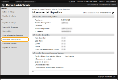 Aparece información sobre el equipo y el administrador del sistema. El nombre de dispositivo y otra información del administrador del sistema mostrada aquí corresponden a las opciones de [Información del administrador del sistema] en la página [Gestión de usuarios] o en [Opciones de información del dispositivo] en la página [Gestión de dispositivos].