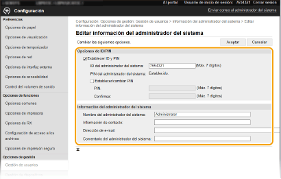 Algunas de las opciones solo pueden cambiarse si ha iniciado sesión en el Modo de administrador del sistema.