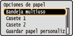 Una vez registradas las opciones de papel predeterminadas, la pantalla de configuración del papel no aparece cuando se carga papel, y se utiliza la misma configuración en todo momento. Si carga un tamaño o tipo de papel diferentes sin cambiar las opciones de papel, es posible que el equipo no imprima correctamente. Para evitar este problema, seleccione <Especificar cuando cargue papel> en el paso 3, y, a continuación, cargue el papel.