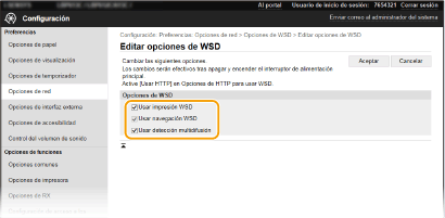 Seleccione la casilla de verificación para imprimir a través de WSD. Cuando no utilice la impresión WSD, quite la marca de la casilla de verificación. [Usar navegación WSD]
