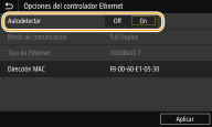 Ethernet es un estándar de comunicación de datos en una red de área local (LAN). Puede configurar el modo de comunicación y el tipo de Ethernet. En general, el equipo puede utilizarse sin cambiar los predeterminados (<Opciones del controlador Ethernet>), pero puede cambiar estas opciones para adaptarlas a su entorno de red.