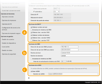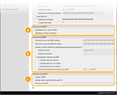 Seleccione la casilla de verificación para actualizar dinámicamente los registros DNS cuando cambie la dirección IP del equipo. Cuando especifique el intervalo entre las actualizaciones, introduzca el tiempo en horas en el cuadro de texto [Intervalo de actualización dinámica de DNS]. [Opciones de mDNS][Usar mDNS]