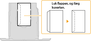 I dette afsnit beskrives, hvordan du ilægger kuverter i den ønskede retning, samt de fremgangsmåder, du skal udføre, før du ilægger kuverter. Se Ilægning af papir i papirskuffen eller Ilægning af papir i universalbakken for at få en beskrivelse af den generelle fremgangsmåde for ilægning af kuverter i papirskuffen eller universalbakken.