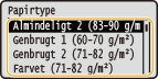 Hvis du ofte har brug for at ændre det ilagte papir, skal du indstille det til <Frit>; dette vil reducere antallet af nødvendige trin til at ændre indstillingen hver gang. Hver dog opmærksom på, at denne indstilling lader maskinen udføre udskrivning, selv hvis der er uoverensstemmelse mellem papirtypeindstillingen i printerdriveren og den papirtype, som rent faktisk er ilagt maskinen.