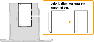 Denne delen beskriver hvordan du legger inn konvolutter i retningen du ønsker, samt prosedyrene som du må utføre før du legger inn konvolutter. For en beskrivelse av den generelle prosedyren for å legge konvolutter i papirskuffen eller flerfunksjonsskuffen, kan du se Legge papir i papirskuffen eller Legge papir i flerfunksjonsskuffen.