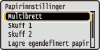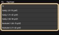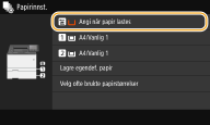 Etter at den standard papirinnstillingen er registrert, vises ikke papirinnstillingsskjermbildet når papir er lagt inn, og den samme innstillingen brukes alltid. Hvis du legger inn et annet papirformat eller -type uten å endre papirinnstillingene, kan det hende at maskinen ikke skriver ut riktig. For å unngå dette problemet velger du <Angi når papir lastes> i trinn 3, og deretter legger du inn papiret.