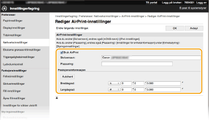 Lar deg kontrollere verdiene som er angitt i innstillingene for AirPrint, som navn og plassering for maskinen. Du kan klikke på [Rediger] hvis du vil endre innstillingene.