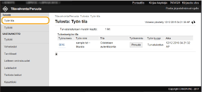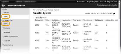 Valitse pysäytetyn asiakirjan tai turvatulostusasiakirjan [Työnumero], jos haluat nähdä tarkat tiedot. Voit tarkistaa tulostetun asiakirjan käyttäjänimen ja sivumäärän.