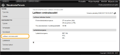 Enimmäistulostusnopeus ja laitteen ominaisuudet näytetään.
