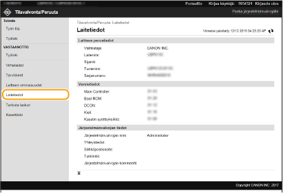 Tiedot laitteesta ja järjestelmänvalvojasta näytetään. Laitenimi ja muut tässä näytettävät järjestelmänvalvojan tiedot vastaavat asetuksia kohdassa [Järjestelmänvalvojan tiedot] sivulla [Käyttäjähallinta] tai kohdassa [Laitetietojen asetukset] sivulla [Laitteen hallinta].