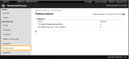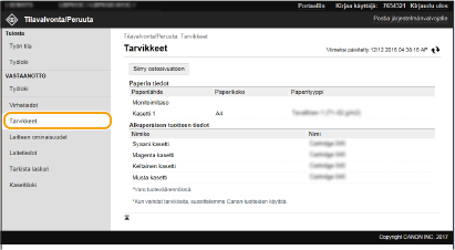 Paperilähteen paperikoko ja -tyyppi, värikasetin mallinumero yms. näytetään. Voit näyttää sivun myös napsauttamalla portaalisivulla (pääsivulla) [Tarkista tarvikkeiden tiedot] (