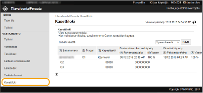 Voit tarkistaa väriainekasettien käyttölokit ja muut lokit. Näyttö voidaan vaihtaa jokaista väriainekasetin väriä varten.