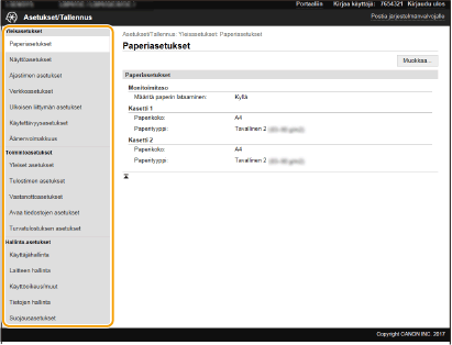 Voit muuttaa laitteen eri asetuksia etäkäyttöliittymän avulla. Useimmat asetukset voidaan määrittää myös laitteessa, mutta jotkin asetukset voidaan määrittää vain etäkäyttöliittymällä. Tässä osiossa kuvataan laitteiden asetusten muuttamisen peruskulku etäkäyttöliittymää käytettäessä.