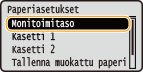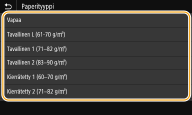 Kun oletuspaperiasetus on tallennettu, paperiasetusnäyttöä ei näytetä, kun paperia lisätään, ja samaa asetusta käytetään aina. Jos lisäät erilaista paperikokoa tai -tyyppiä vaihtamatta paperiasetuksia, laite ei ehkä tulosta oikein. Voit välttää tämän ongelman valitsemalla <Määritä paperin lataaminen> vaiheessa 3 ja lisäämällä sitten paperin.