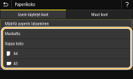 ![]() ![]() Jos usein käytettävä paperikoko tallennettiin painikkeisiin <S1>–<S3>, ne voidaan palauttaa yhdellä kosketuksella. Mukautetun paperikoon tallentaminen