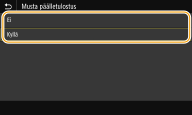Vaikka valittaisiin <Kyllä>, tiedot tulostetaan käyttämällä vain mustaa (K) väriainetta asetuksen <Tulostusprofiili> tai <Puhdas musta teksti> mukaan.