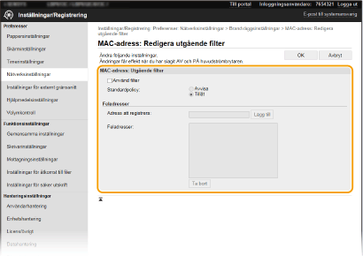 Om MAC-adresser anges felaktigt kan det bli omöjligt att använda enheten från fjärranvändargränssnittet. I så fall måste du ange <MAC-adressfilter> till <Av>. <MAC-adressfilter>