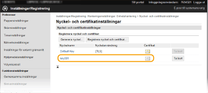 En nyckel och ett certifikat kan inte raderas om det används för något syfte, t.ex. när "[TLS]" eller "[IEEE 802.1X]" visas under [Nyckelanvändning]. Inaktivera i så fall funktionen eller byt ut nyckel och certifikat innan du raderar dem.