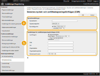 Eftersom certifikat som skapas med enheten inte får en CA-signatur kan det uppstå kommunikationsfel i förhållande till motpartens utrustning. Om du vill att certifikatmyndigheten utfärdar ett certifikat med CA-signatur behöver du inhämta CSR-data (Certificate Signing Request). Administratören kan hämta dessa från fjärranvändargränssnittet. När certifikatet är utfärdat registrerar du det i nyckeln tillsammans med CSR.